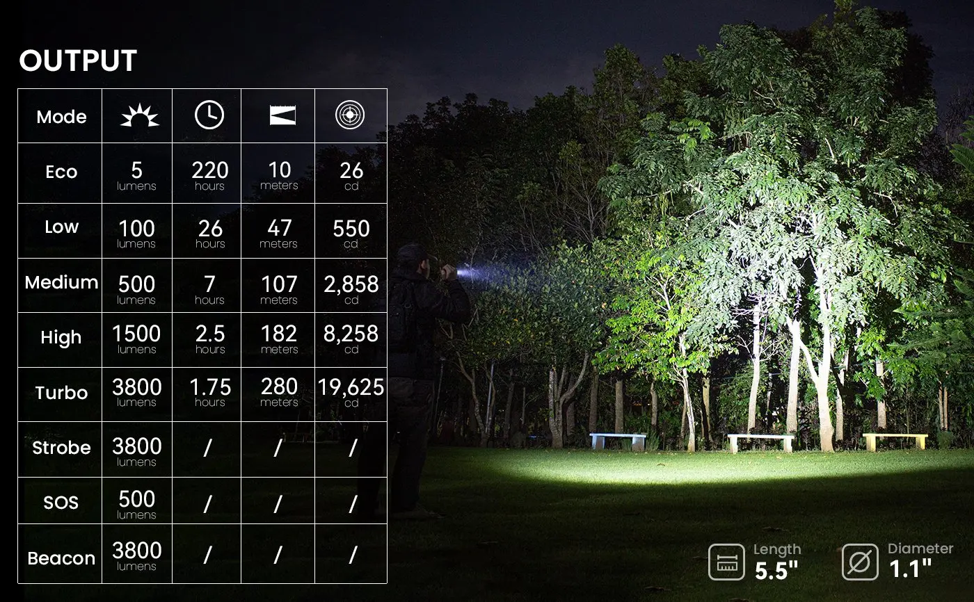 Corpo da lanterna: liga de alumínio de grau aeroespacial 6061, fabricada em CNC com especificação de grau militar tipo III, acabamento antiabrasivo para obter corpo sólido de construção, geometria anti-colisão e melhor troca de calor.